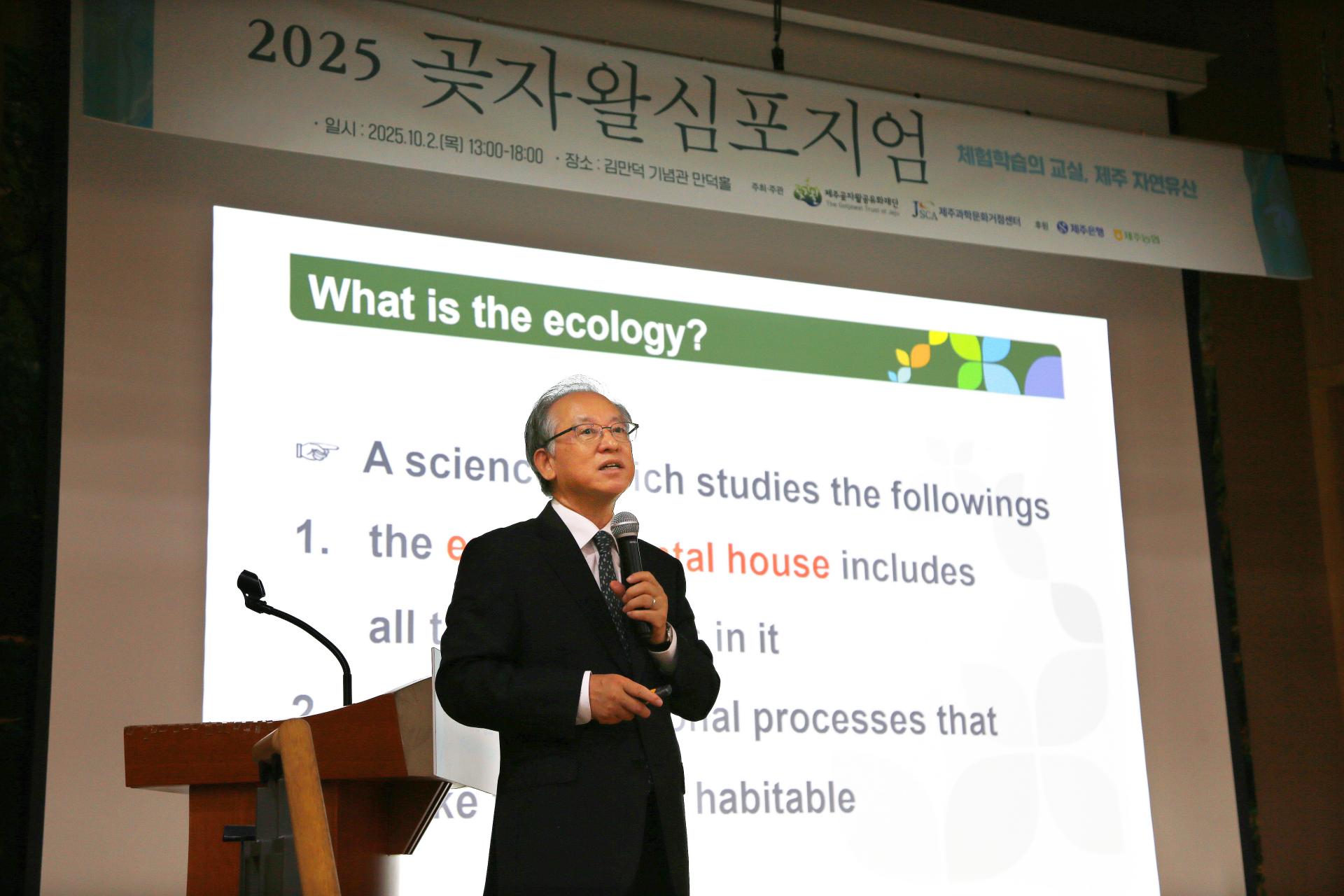 본 심포지엄은 기조강연과 주제발표, 패널토론 순으로 진행되었습니다. 기조 강연에 나선 이창석 국립생태원장은 “생태학은 단순한 학문이 아니라 인류 생존과 지속가능한 미래를 위한 필수 지식” 이라며, “제주도는 생물다양성의 핫스팟으로서 생태계 지속가능성을 위한 교육과 실천이 절실하다”고 말했습니다.
