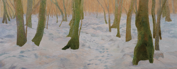 곶자왈을 처음 그릴 때는 보이는 대로 형상 그대로 그렸어요. 곧은 붓으로 곧게 그렸다고 할까요. 그러다가 나중에는 형상보다 제 안의 느낌을 전달하고 싶었어요. 기법을 바꾸었죠. 전통 회화의 점묘법처럼 물감을 캔버스에 툭툭 치듯이 그렸지요. 붓 말고도 손으로 또는 빗자루로도 하고요. 이것이 곶자왈을 곶자왈답게 그리는 방법 같아요. 가까이서 보면 추상적인 것 같지만, 멀리서 보면 그림이 오히려 잘 보입니다. 그림 뒤쪽에 숲이 보이는 것도 같고요.