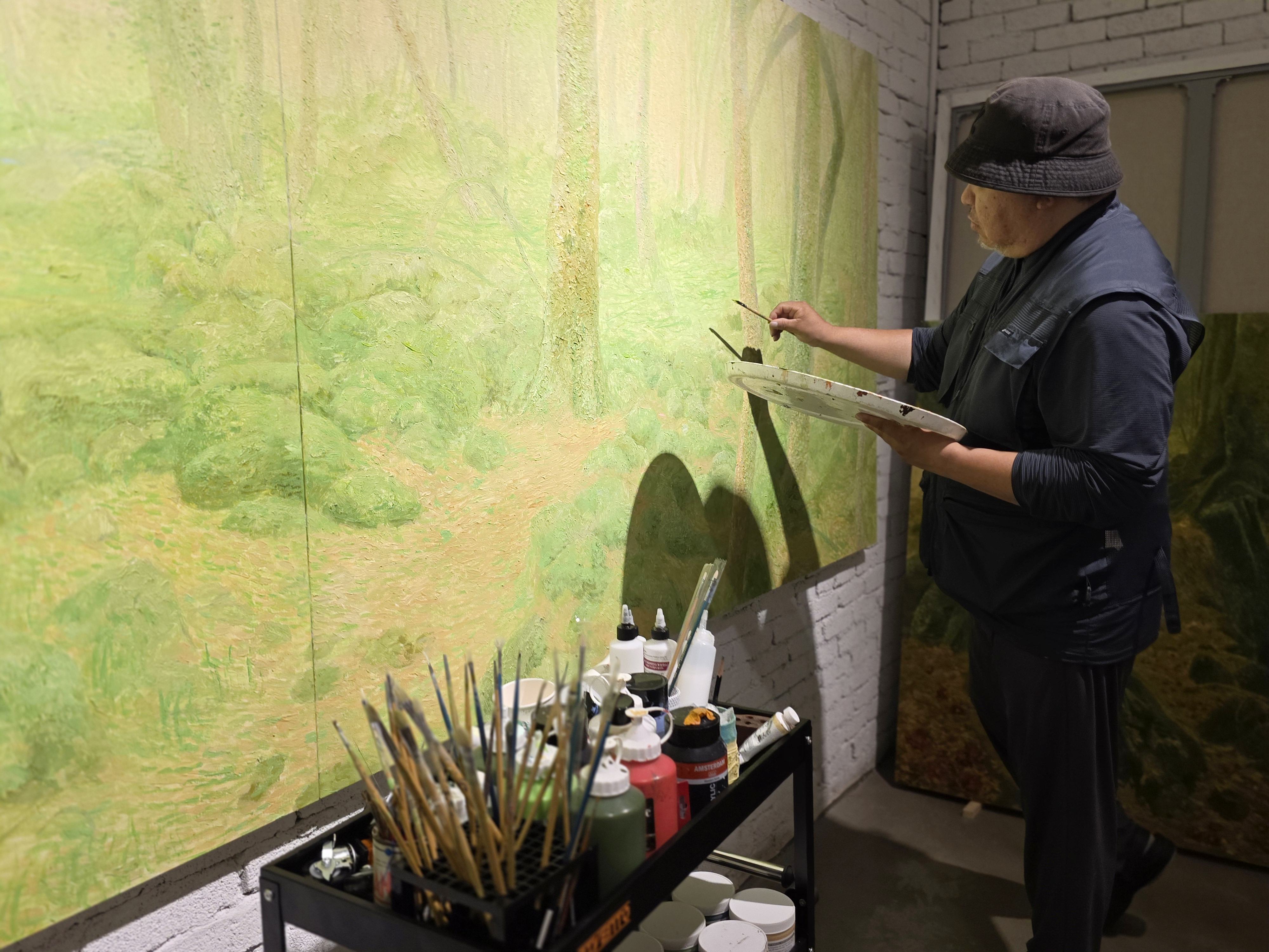 곶자왈 작품을 그리는 강동균 화백. 그리는 방법을 곶자왈답게 자유롭게 바꿔 작품을 완성한다.