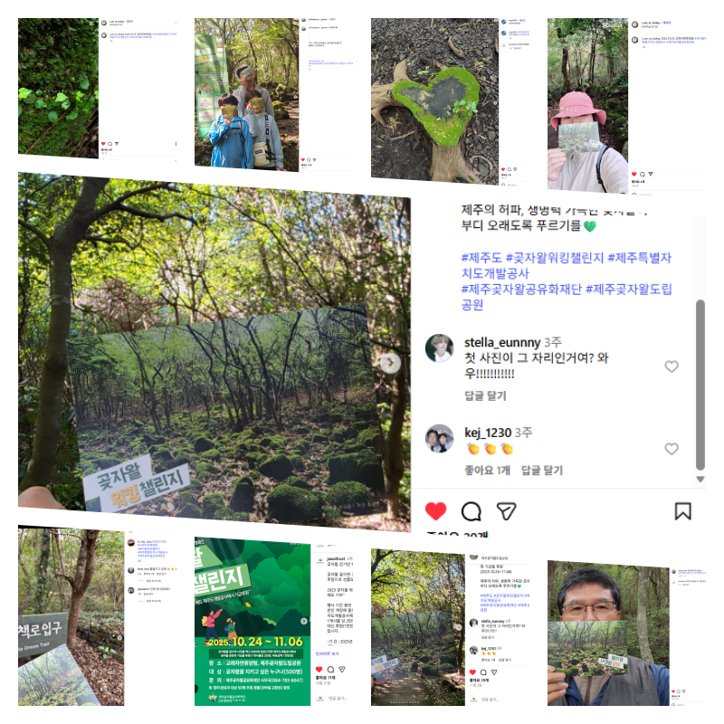 2025 곶자왈워킹챌린지가 많은 분들의 관심과 참여로 총 859개(인스타그램 44건, 블로그 1건, 카카오톡채널 815건)의 참여 인증 SNS 게시물이 업로드 되어 목표를 초과 달성하여 종료되었습니다.